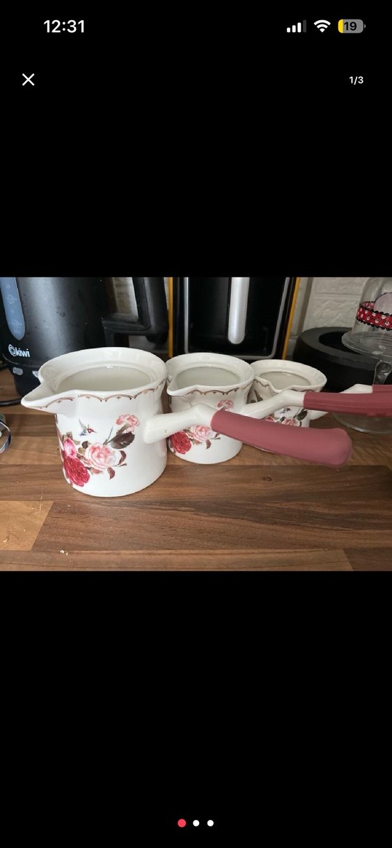 Pastel çiçek desenli beyaz porselen 3'lü cezve seti, pembe el yakmaz saplıdır