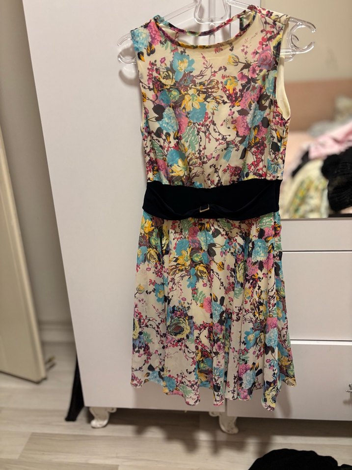 Çiçek desenli, kemerli ve kolsuz midi elbise. Yumuşak sentetik kumaştan, bohem tarzda günlük kullanım için uygun.
