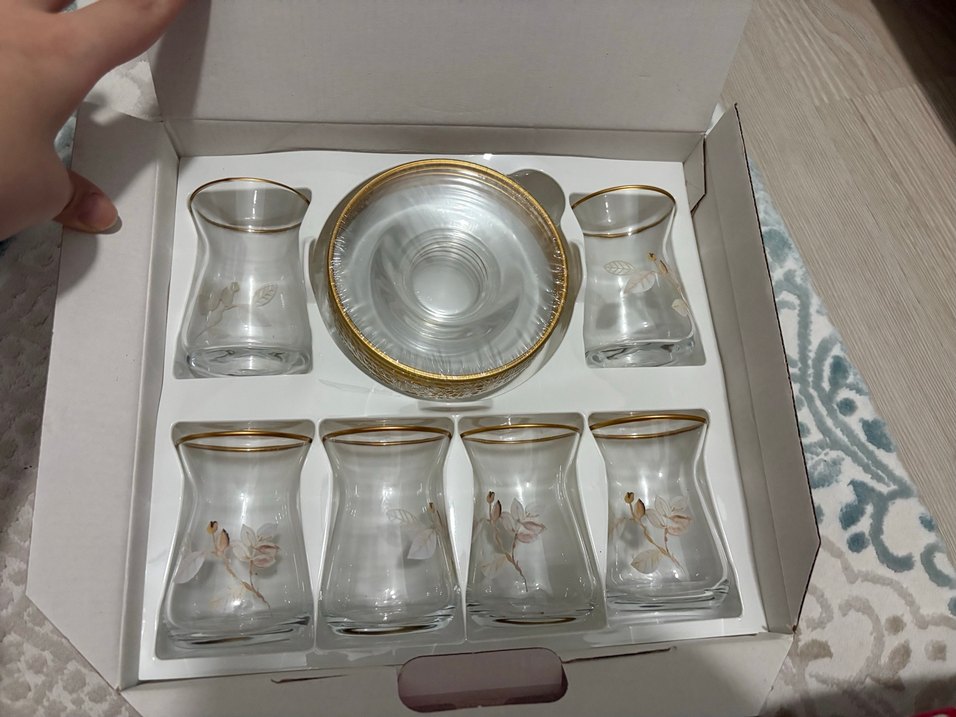 Altın yaldızlı çiçek desenleriyle süslenmiş, 6 adet cam çay bardağından oluşan set. Hiç kullanılmadı yer açılması için satıyorum hiçbir kusuru yoktur