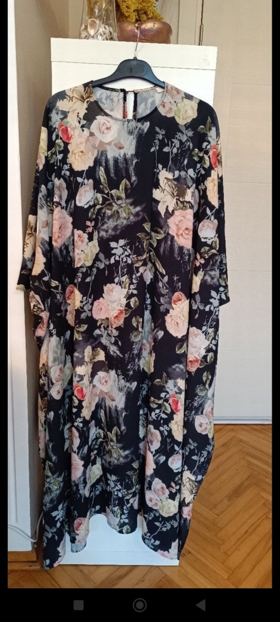 Haze desenli std beden , bol kesim ve drapeli kısa kollu, V yakalı. Yumuşak sentetik kumaştan, koyu çiçek desenli, günlük kullanıma uygun kadın abaya