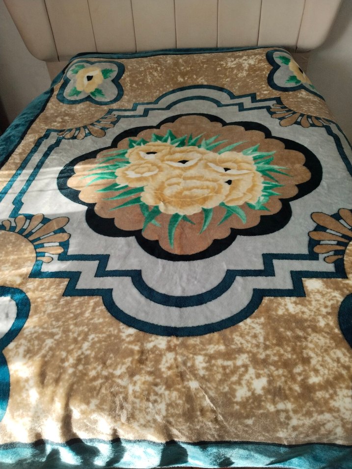 Açık kahverengi, yeşil, sarı ve bej tonlarında çiçek desenli, yumuşak ve sıcak tutan battaniye. 1 kez kullanıldı
