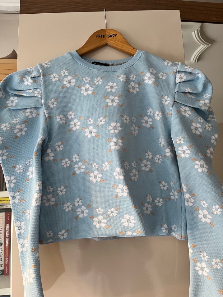 Trendyol Çiçek Desenli Açık Mavi Karpuz Kollu Krop Bluz