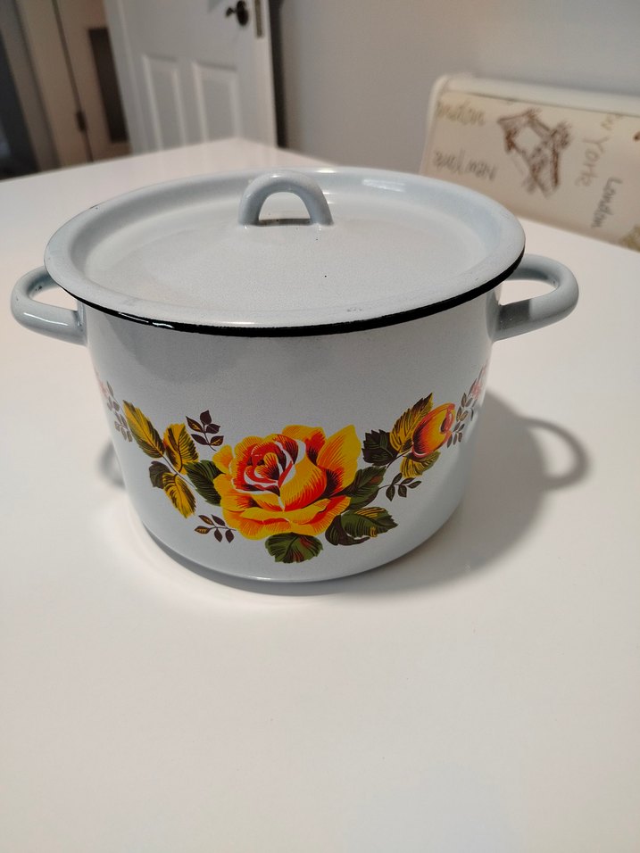 İki yandan kulplu, açık mavi, vintage, emaye tencere. Üzerinde sarı ve turuncu güllerden oluşan canlı çiçek deseni bulunur. Resimlerde de görüldüğü gibi sadece kapağında iki yerinde sır dökülmesi vardır. Yükseklik 13 cm, genişlik 20 cm dir.