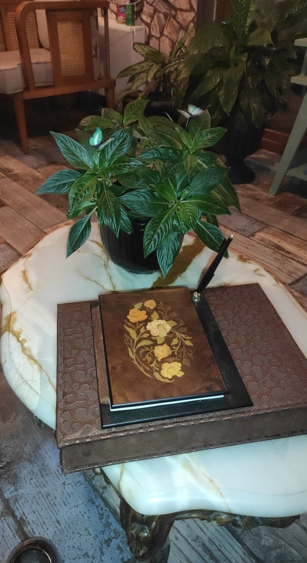 Çiçek işlemeli ahşap kapaklı şiir kitabı, yanında kalemlikli dokulu bir tabanla birlikte klasik tasarım ve kullanışlılığı bir araya getirir. Antika