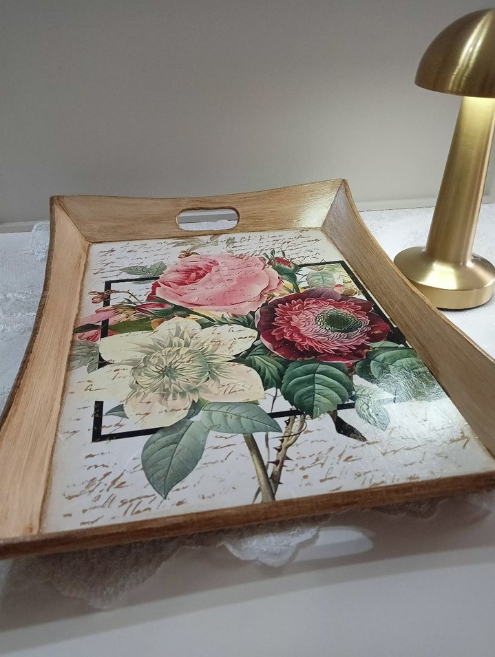 Ahşap tepsi, canlı renklerle çiçek desenli, servis veya dekorasyon için uygun. Tamamen el emeği ile yapıldı.. eskitme görünüm verildi