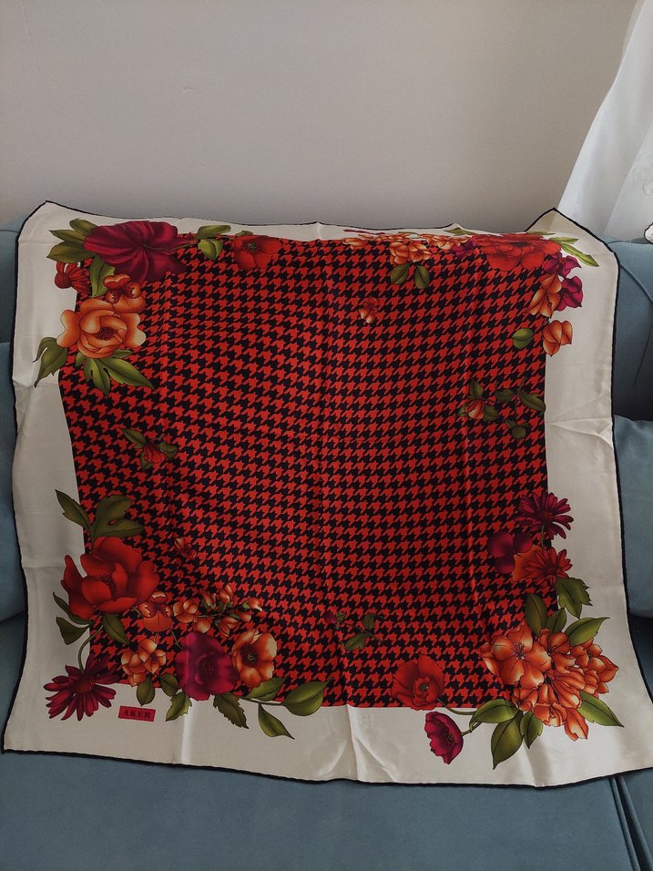 Koyu renkli çok renkli çiçek desenli, ipek kumaş Aker markası. Yeni gibi