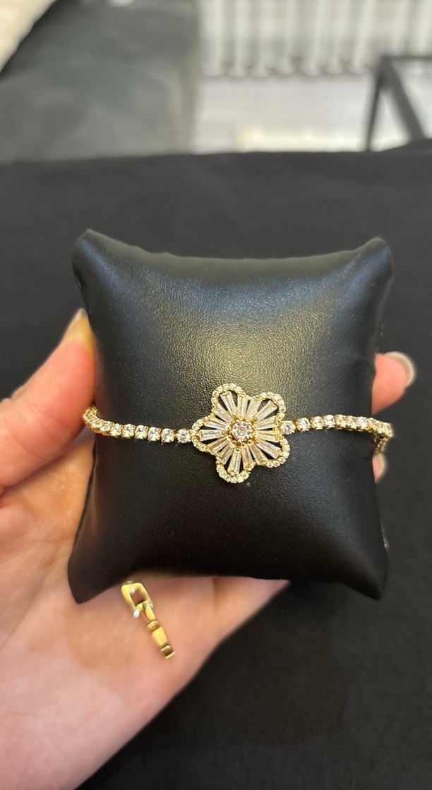 Altın renkli kadın bileklik, çiçek desenli ve payet detaylıdır. Düğünler ve klasik şıklık için uygundur. Ürün zirkon ve çeliktir.