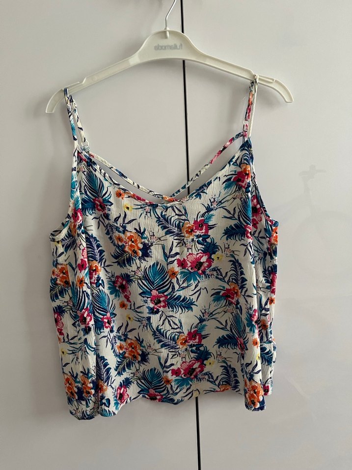 İnce askılı, bol kesim, hafif sentetik kumaş üzerine canlı çiçek desenli, drapeli bohem tarzda bluz.
