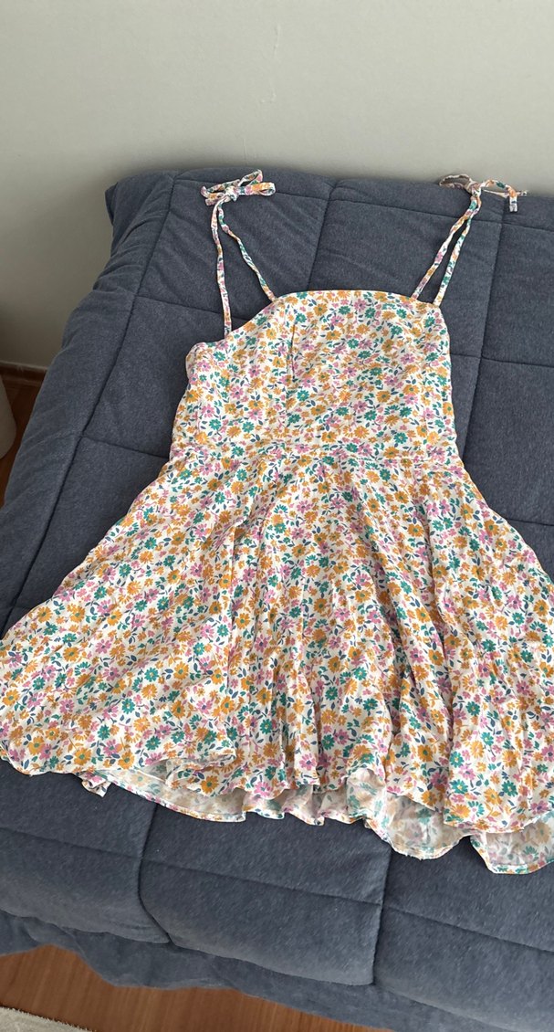 Askılı, straplez bohem mini elbise, fırfırlı ve bol kesimli, pastel çiçek desenli, günlük kullanım için uygun.
