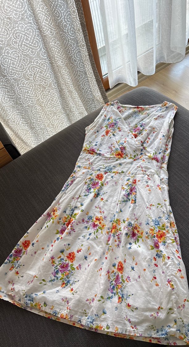 V yaka, kolsuz, çiçek desenli beyaz diz hizası (boyum 157) şirin elbise küçük bir sökük var , astarı mevcut , yazın mükemmel oluyor altına sandaletle , tüm bedeni ölçüleri mevcuttur
