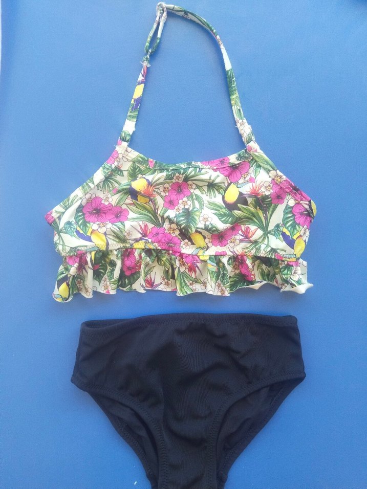 Çiçek desenli askılı üst ve siyah alt parçadan oluşan renkli bikini, plaj için uygundur .
