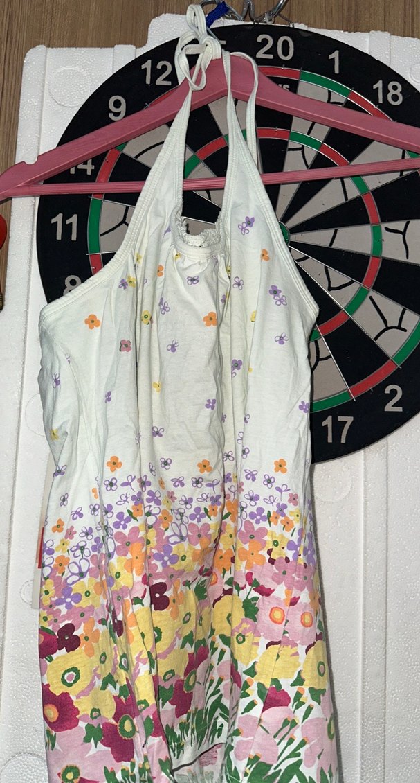 Askılı, kolsuz kız gömleği, bol kesim ve drapeli tasarıma sahiptir. Pastel çok renkli batik ve çiçek desenleriyle bohem ve retro tarzını yansıtır. S beden giyen bir yetişkin için uygun