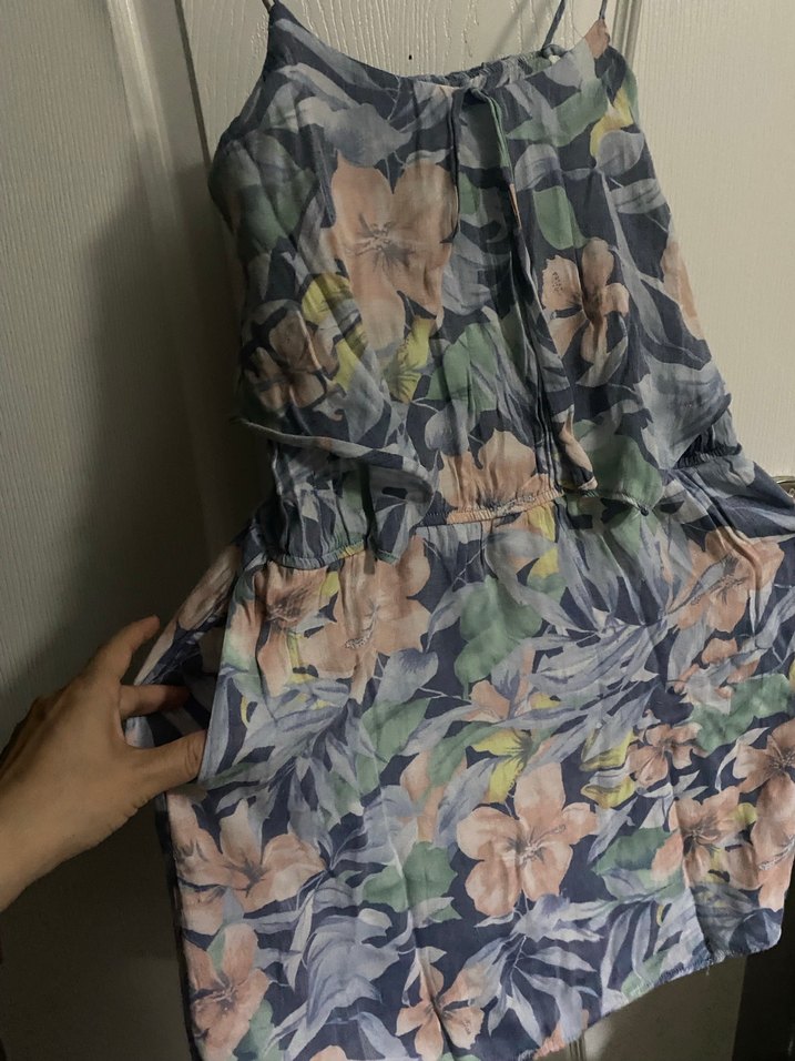 Askılı, drapeli, bol kesim midi elbise, pastel çok renkli çiçek desenlidir. Yumuşak sentetik kumaştan, bohem tarzına uygundur.