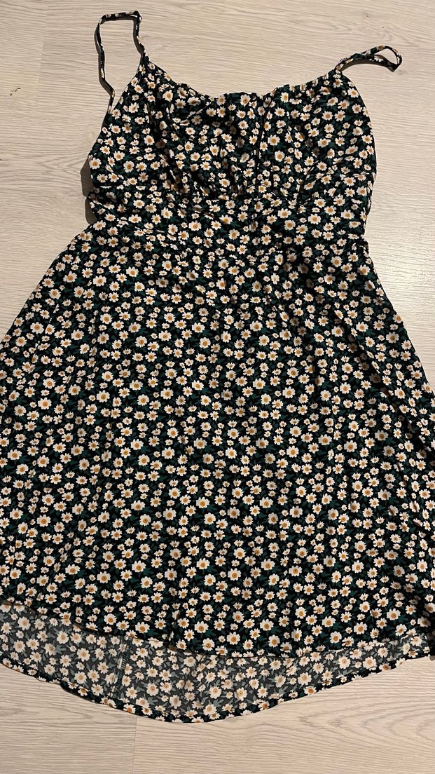 Siyah zemin üzerine küçük çiçek desenli, askılı ve straplez yaka detaylı, volanlı midi elbise. Sentetik kumaştan, bohem tarzında günlük kullanıma uygun.