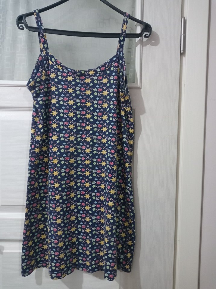 Askılı, midi boy, bol kesim ve çiçek desenli elbise. Yumuşak pamuklu kumaştan, günlük bohem tarzına uygun.