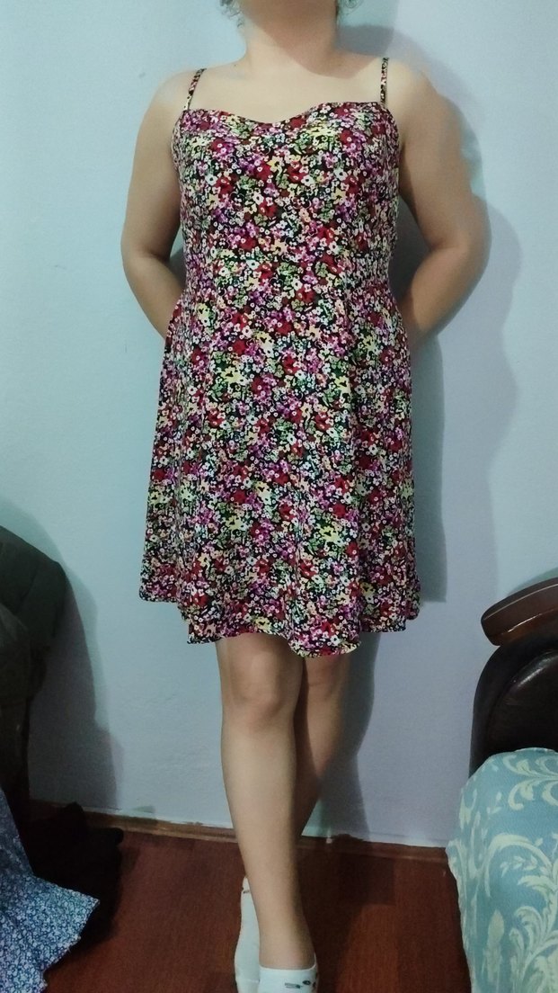 Askılı, çiçek desenli ve dantel detaylı midi elbise, rahat kesimi ve yumuşak sentetik kumaşıyla günlük kullanıma uygundur.
