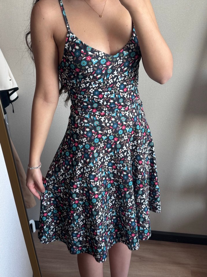 Çiçek desenli, ince askılı, vücuda oturan midi elbise. Akıcı sentetik kumaştan, romantik akşamlar için uygun.