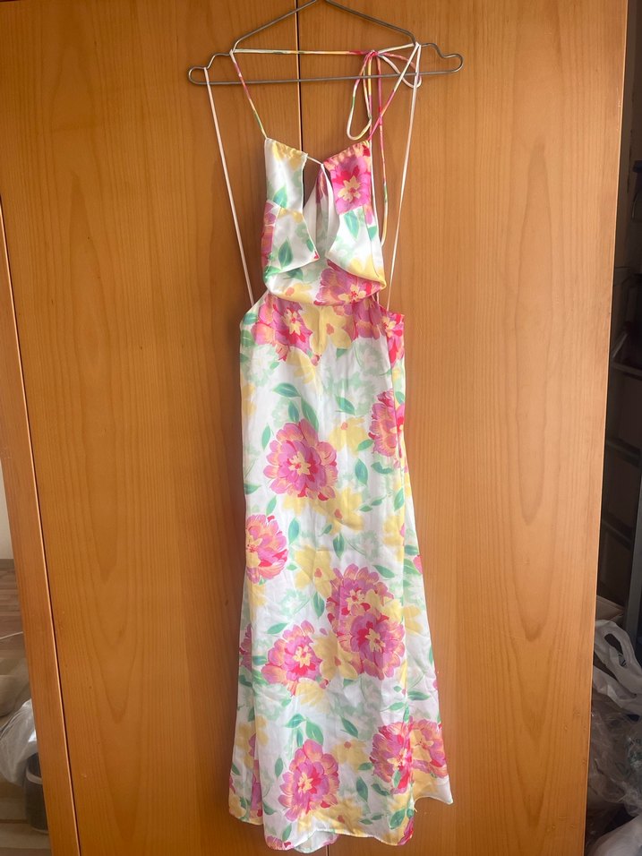 Uzun, bol kesim bohem elbise, askılı ve drapeli tasarıma sahiptir. Yumuşak sentetik kumaştan yapılmış, pastel tonlarda tie-dye çiçek desenlidir, parti için uygundur.