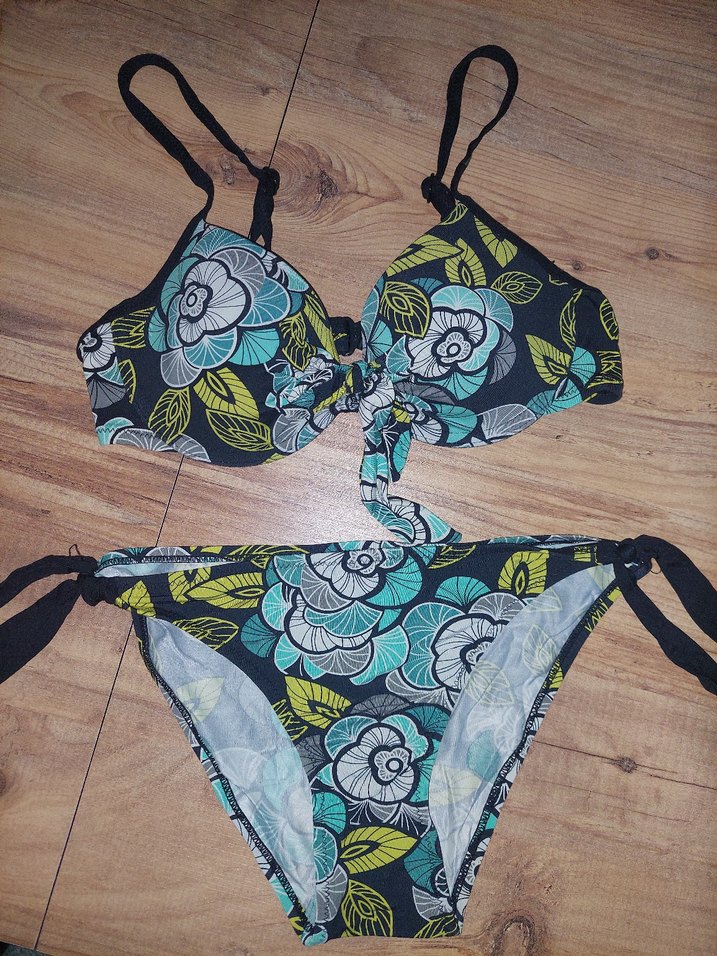 Bağcık detaylı, çiçek desenli ve bohem tarzda, kısa ve dar kesim bikini takımı.