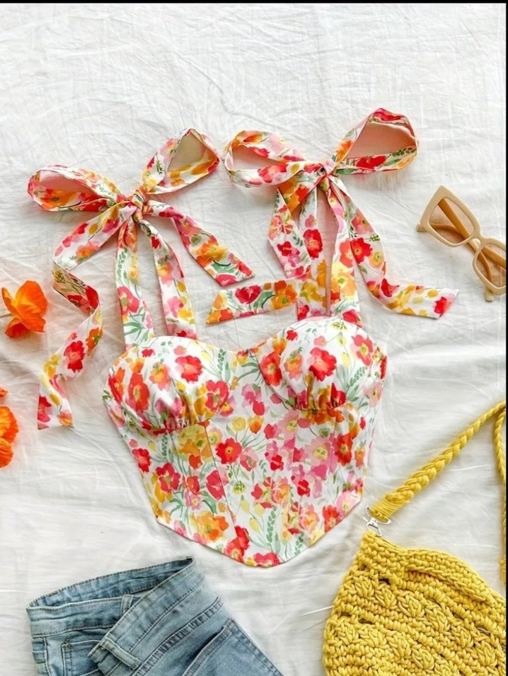 Bağlamalı askılı, çiçek desenli, kısa ve vücuda oturan büstiyer.temudan aldim ama kucuk geldi hiç giyemedim o yuzden xs-s uyumludur göğüs olcunuz cok buyukse almayın cunku sizde benim gibi giuemezsiniiz