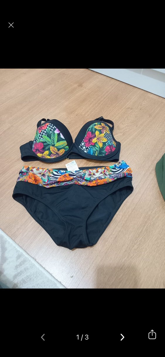 Sıkı kesim, bantlı alt ve askılı üst kısmı ile canlı çiçek desenlerine sahip kadın bikini.