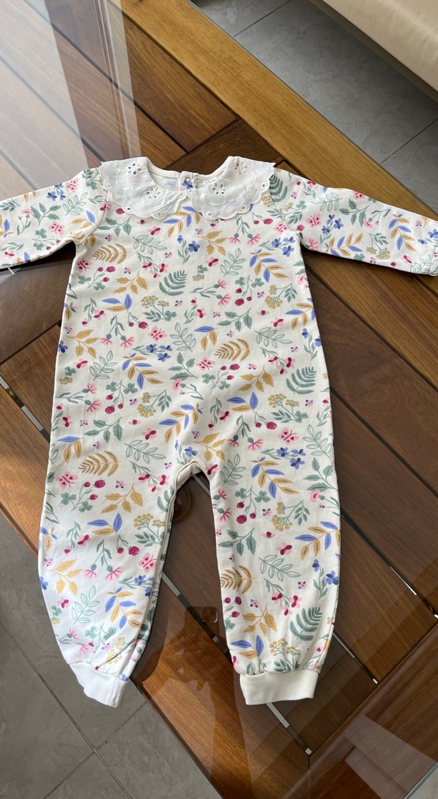 Pastel çok renkli çiçek desenli bebek kız tulumu, dantel yaka ve uzun kollu, yumuşak kumaştan üretilmiştir.