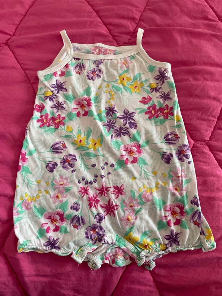 Pastel çok renkli, çiçek desenli ve dantel detaylı bebek tulumu. İnce askılı, alt kısmında çıtçıtlı ve yumuşak kumaşlı.
