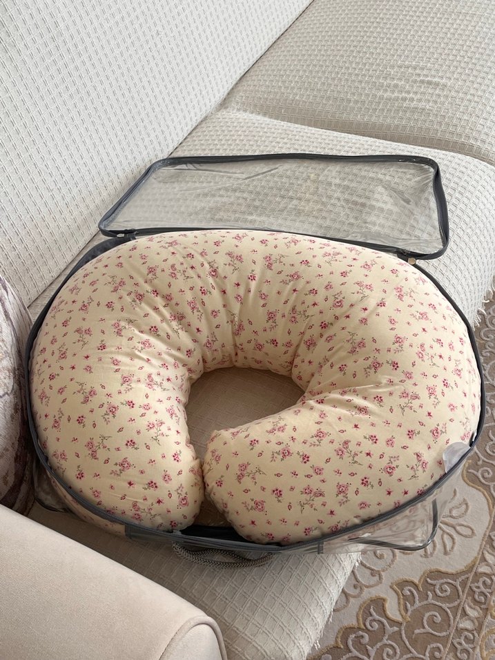 Pastel çiçek desenli bej renkli hamile ve emzirme yastığı, rahat destek sağlar.