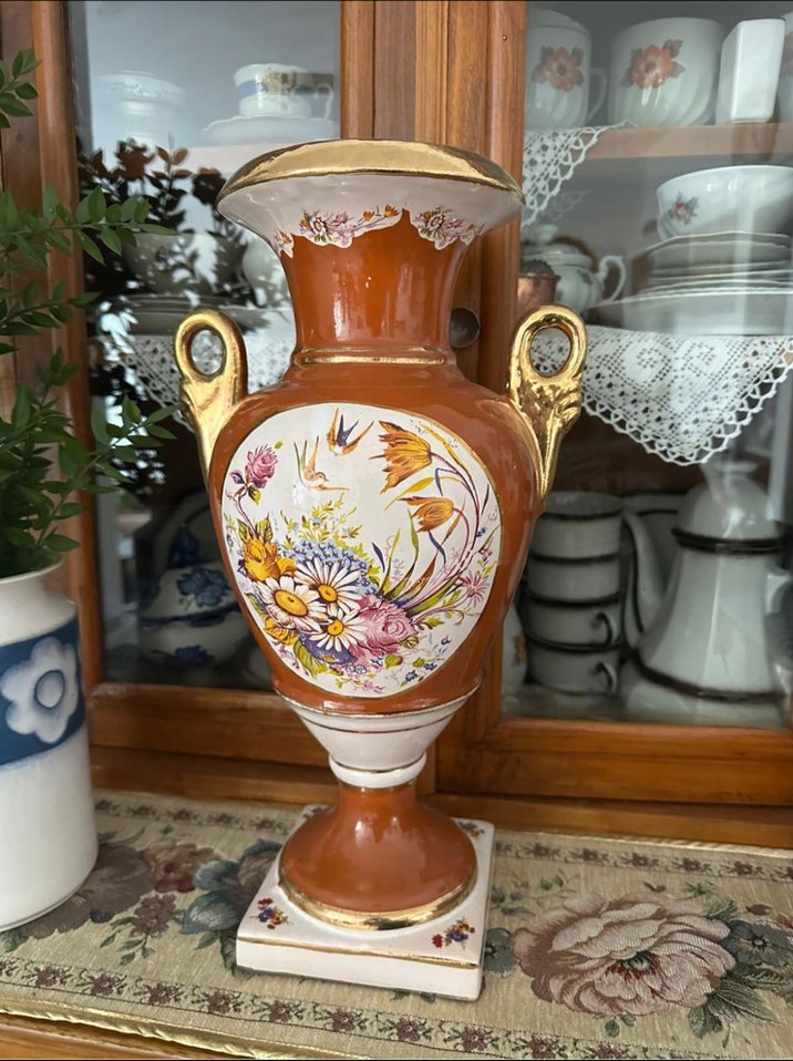 Bej seramikten yapılmış, çiçek desenli, hafif canlı renklere sahip, kulplu ve kare tabanlı dekoratif vazo.
