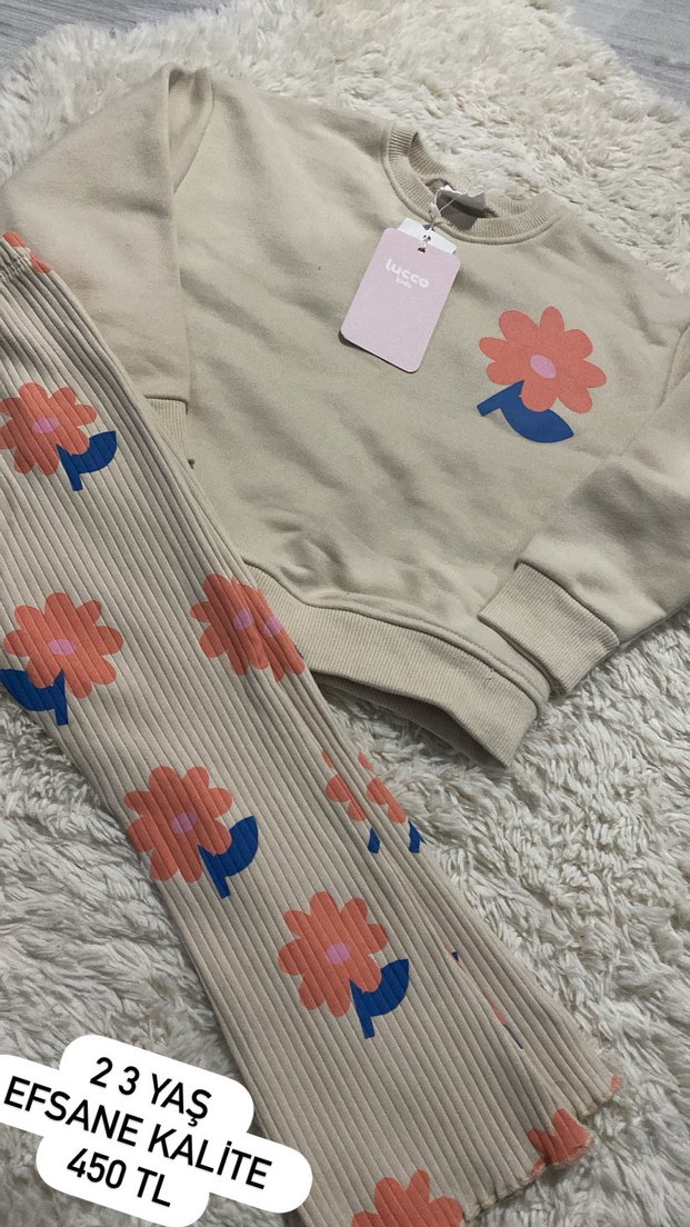 Uzun kollu, çiçek desenli bej triko bebek kız takımı. Üst ve desenli ribanalı pantolon içerir. Optik kod: 23VA.