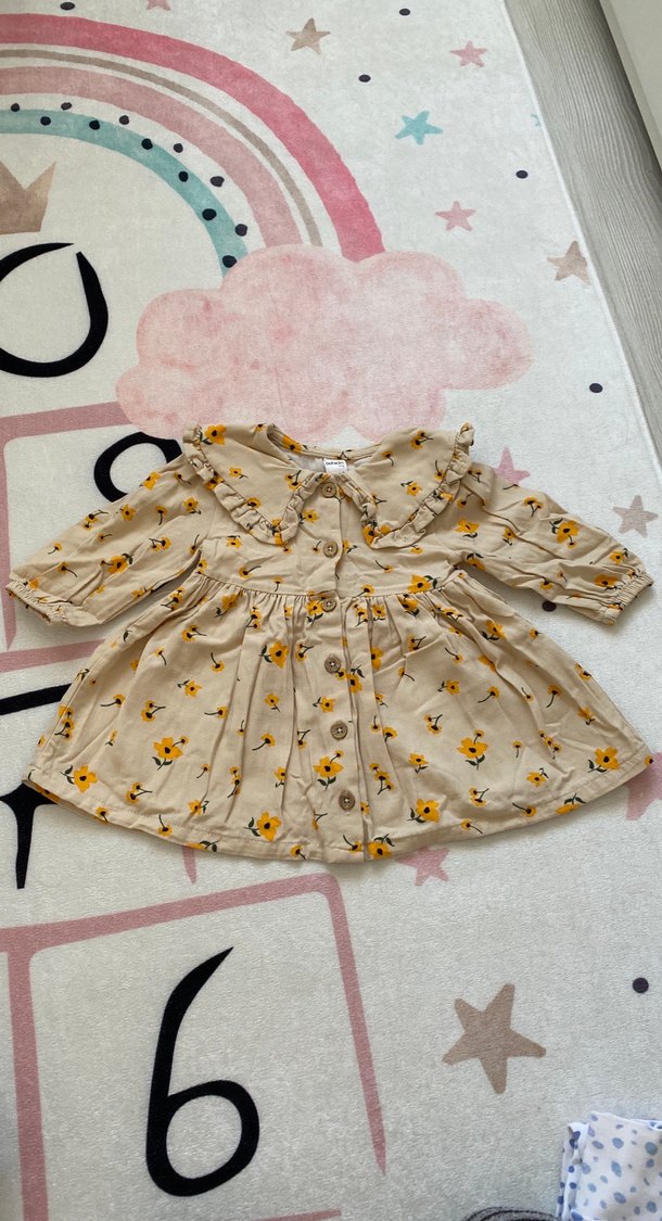 Bej renkli, uzun kollu, bol kesim kız elbisesi. Çiçek desenli, fırfırlı yakalı ve yumuşak sentetik kumaştan yapılmıştır.