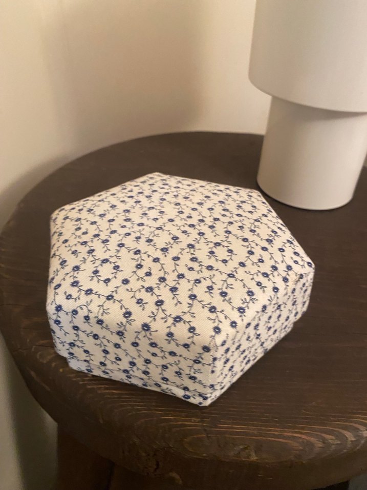 Çiçek desenli, beyaz renkte ve altıgen şekilli hafif desenli takı kutusu.