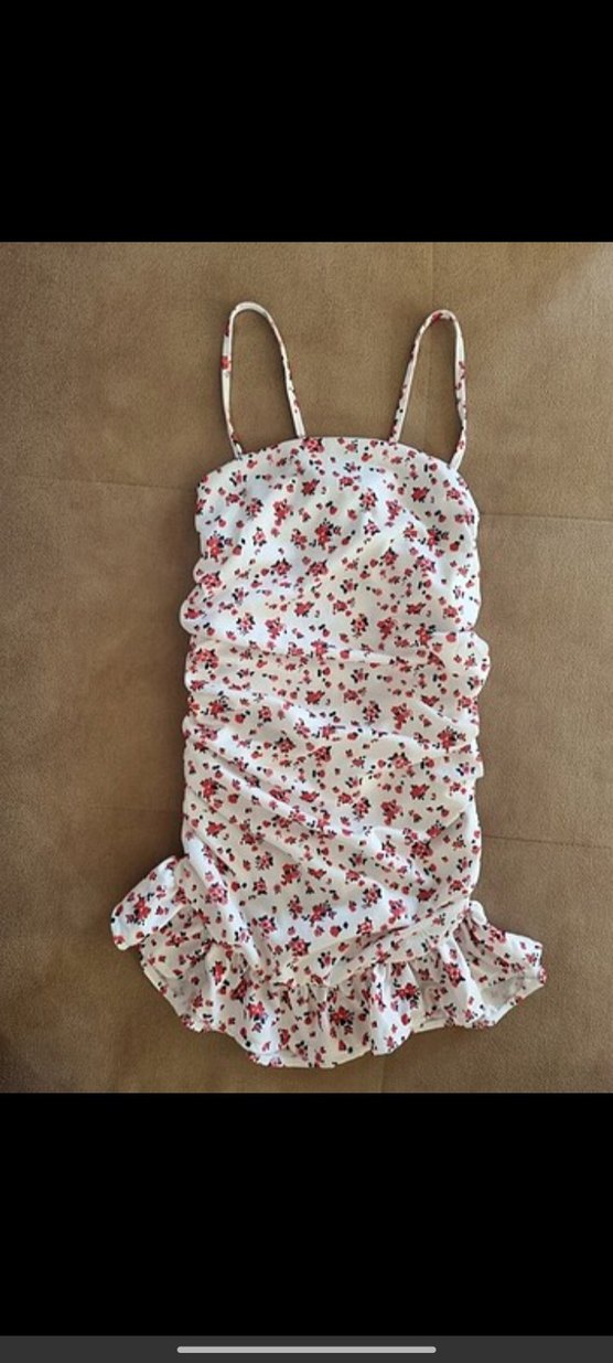 Askılı, çiçek desenli beyaz mayo, midi boy ve fırfır detaylıdır. Vintage bohem tarzı için uygundur.