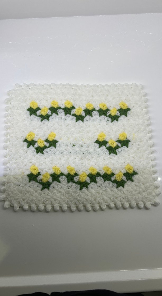 Sarı ve yeşil çiçek desenli dokulu beyaz banyo lifi, banyonuza renk katıyor.