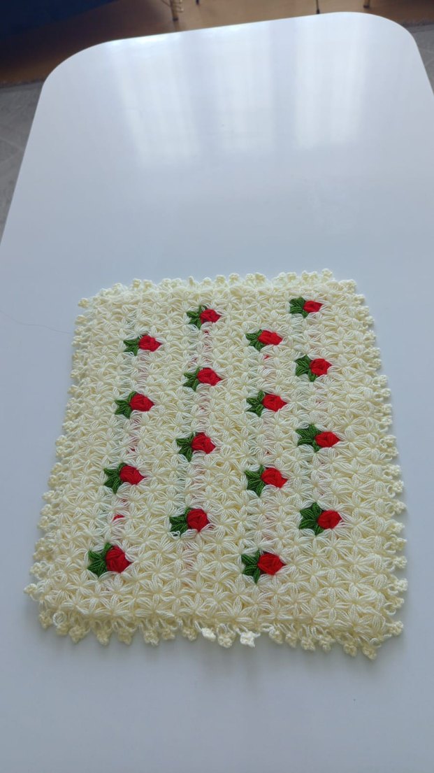 Küçük kırmızı ve yeşil detaylarla süslenmiş dokulu çiçek desenli beyaz banyo süngeri.
