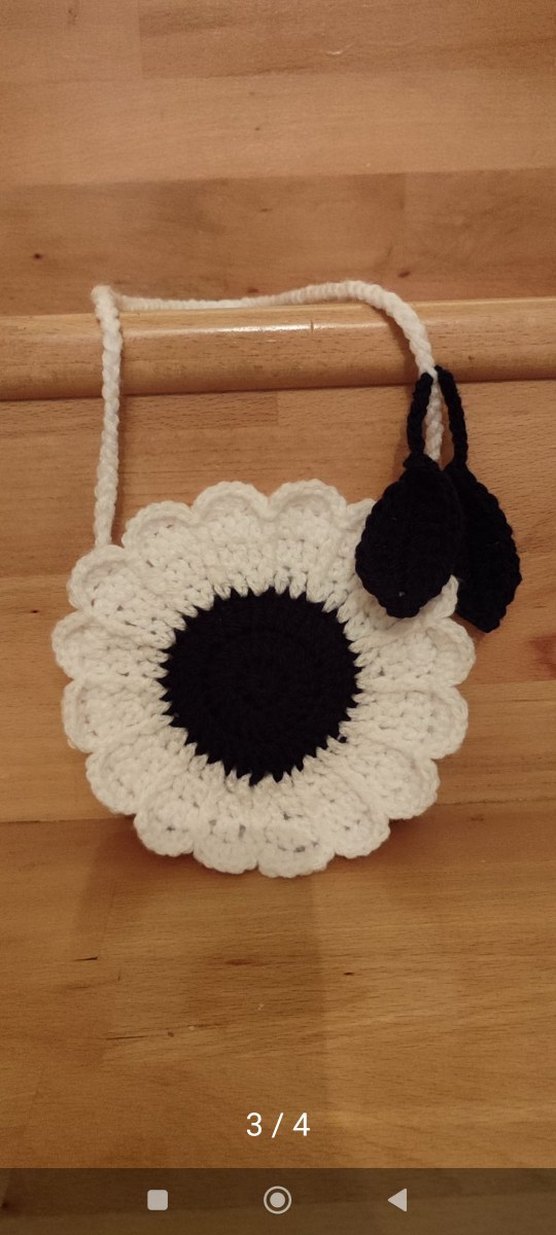 Yuvarlak şekilli, bağlamalı, koyu renkli çiçek desenli beyaz bebek önlüğü.