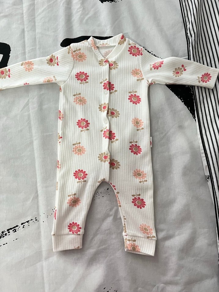 Pastel beyaz renkte, çiçek desenli ve düğmeli bebek kız tulumu, yumuşak kumaştan üretilmiştir. İkizlerim olduğu için hiç giyilmeden büyüdüler.