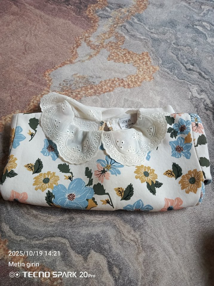 Beyaz zemin üzerine pastel çiçek desenli, dantel yakalı bebek önlüğü. Yumuşak kumaş ve fermuar kapamalı. Tarih ve metin girdisi mevcut.