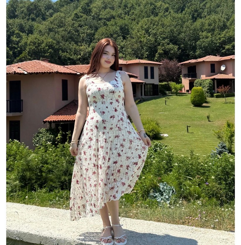 Askılı, straplez, bol kesim midi elbise, hafif beyaz sentetik kumaş ve çiçek desenli dantel detaylarıyla açık hava etkinlikleri için uygundur.