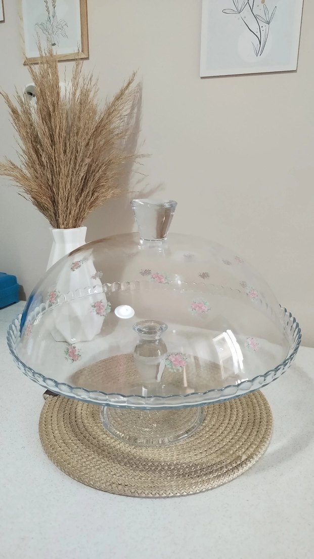 Pastel çiçek desenli beyaz cam kek fanusu, şeffaf kulplu ve dalgalı kenarlı ayaklı tasarıma sahiptir. küçük bir deformesi mevcut kapanınca belli bile olmuyor o yüzden Uygun'a satıyorum.