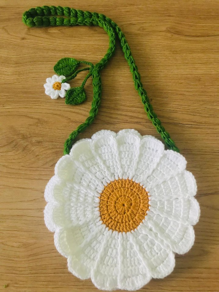 Bohem tarzda, beyaz dantel çiçek desenli, renkli yeşil askılı ve çiçek detaylı çanta.