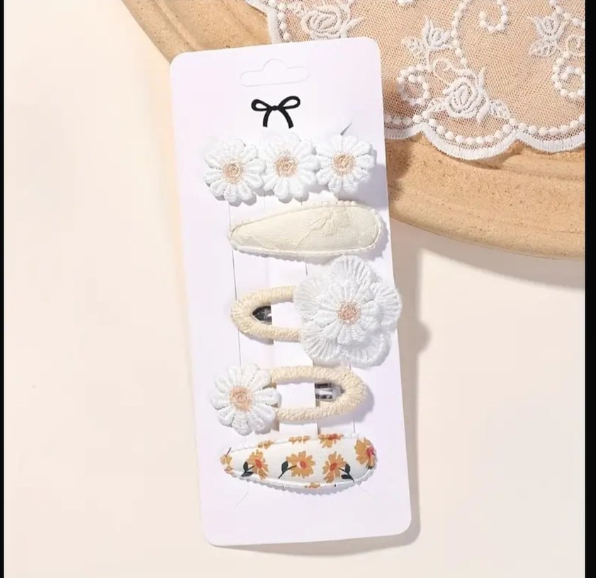 Pastel tonlarda beyaz dantel çiçek desenli çocuk saç tokaları seti, bohem tarz için uygun.