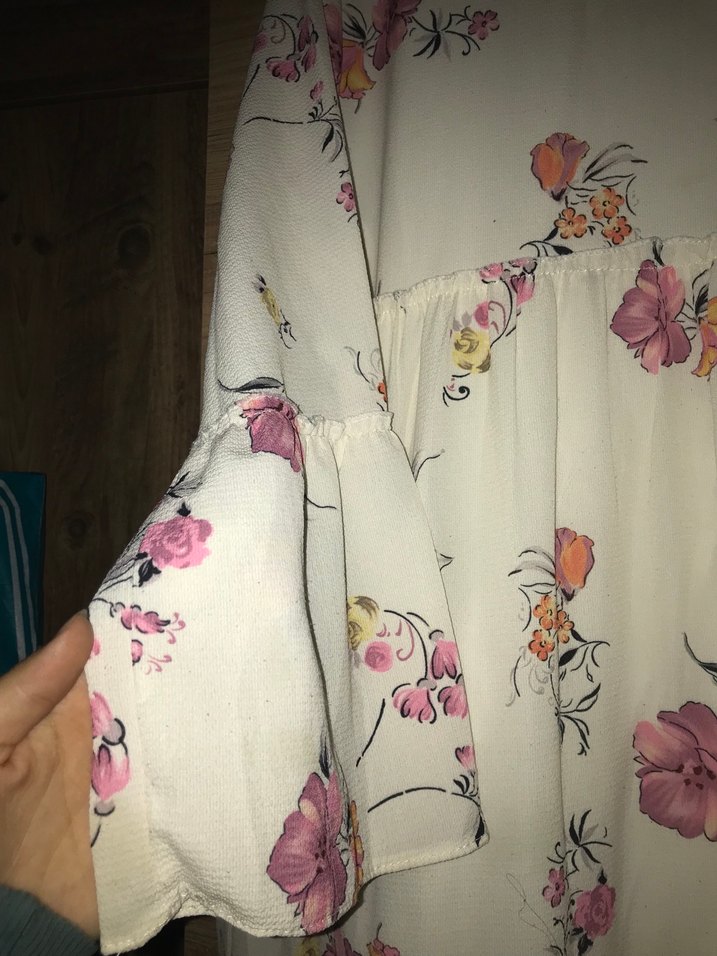 Bohem tarzda, uçuşan beyaz elbise, pastel çiçek desenli, volan detaylı ve askılı kollu, kayık yaka ile rahat bir kesime sahiptir.