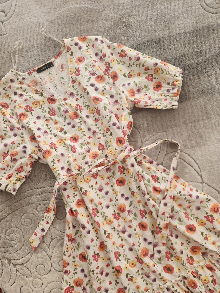 Çiçek desenli, fırfırlı ve V yakalı beyaz elbise. Keten kumaştan kısa kollu ve rahat bol kesimdir. Kuşaklı ve lcw marka