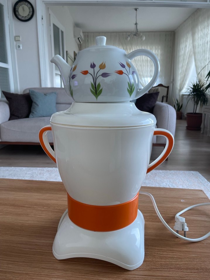 Üstünde çiçek desenleri olan beyaz elektrikli çaydanlık, turuncu detayları ve kıvrımlı kulp ve ağızlığı ile dikkat çekiyor.