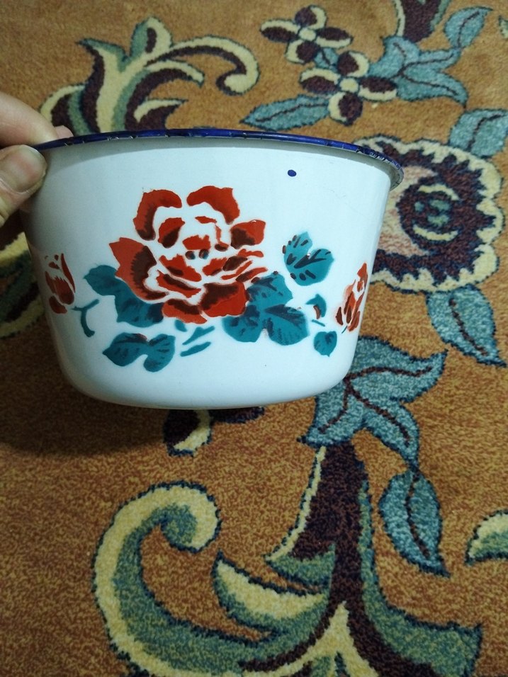 Beyaz emaye kase, üzerinde kırmızı ve turkuaz çiçek desenleriyle renkli bir görünüme sahip. Geleneksel tarzda, sağlam yapıda.
