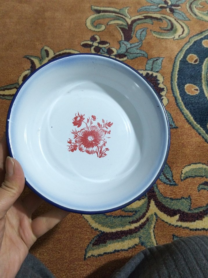 Ortasında renkli çiçek deseni ve mavi kenarı bulunan beyaz emaye tabak. ️