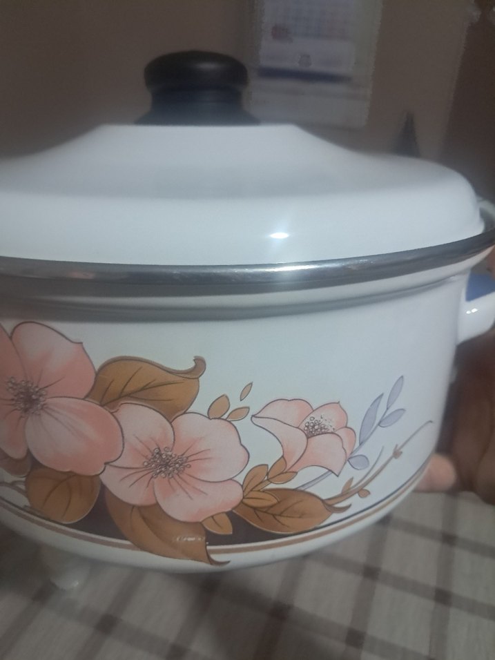 Çiçek Desenli Beyaz Emaye Tencere