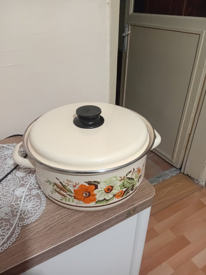 Üzerinde çiçek desenleri bulunan beyaz emaye tencere, kapakta siyah kulplu.