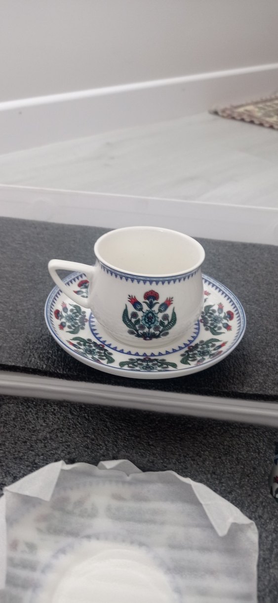 Beyaz fincan ve tabağın üzerinde koyu renkli çiçek desenleri bulunur, kulplu ve şık tasarımlıdır. ☕